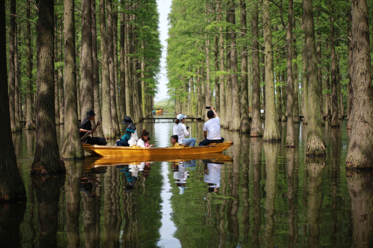 5月1日,游人在江蘇省揚州市寶應湖國家濕地公園游玩。新華社發(fā)(沈冬兵 攝)