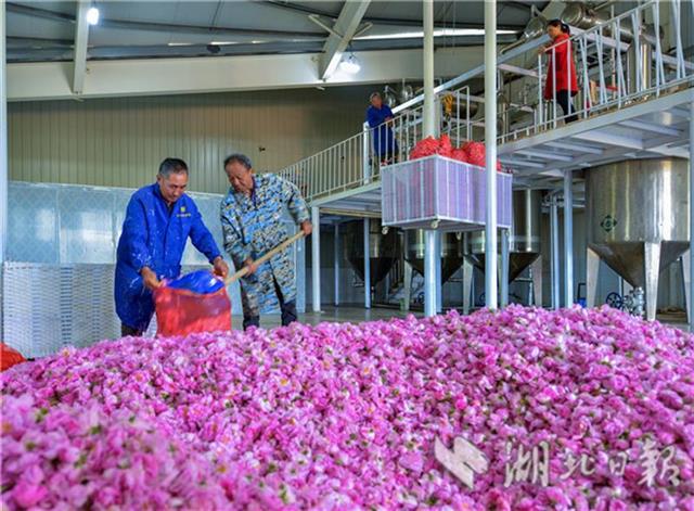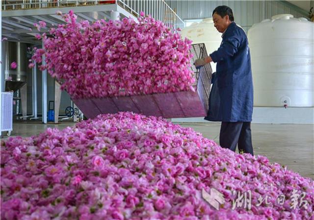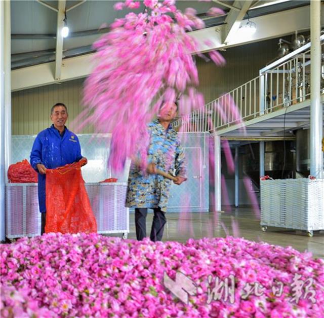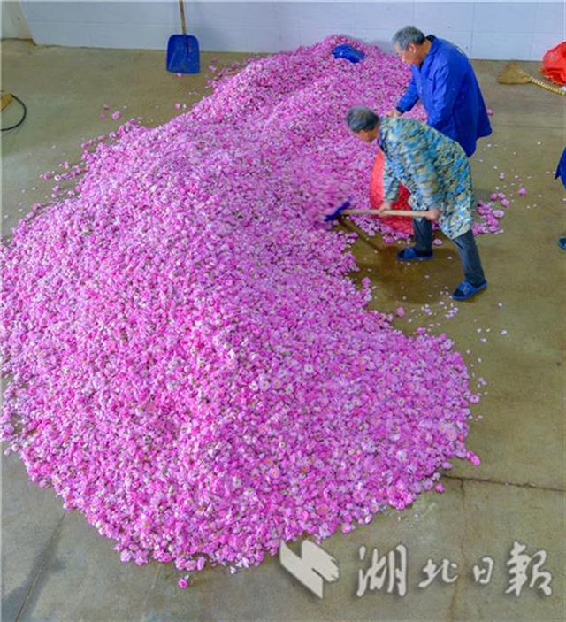 4月30日,工人整理當天收購的玫瑰鮮花。羅曼假日玫瑰莊園是湖北天景龍農業科技有限公司投資6億元建設的產業融合發展項目,該項目采取“公司+基地+農戶”的運作模式,發展玫瑰種植、精油提取、旅游觀光等,目前已建成規模達1000畝的玫瑰種植基地、精油萃取工廠、產品體驗中心。通過土地流轉、吸納就業等方式,帶動周邊馬堰、土陂等15個村200多位村民持續穩定脫貧。(視界網鄭毅 鄭瑋攝)