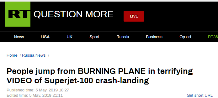 RT:蘇霍伊100(SSJ-100)客機(jī)緊急降落,乘客跳下起火飛機(jī)