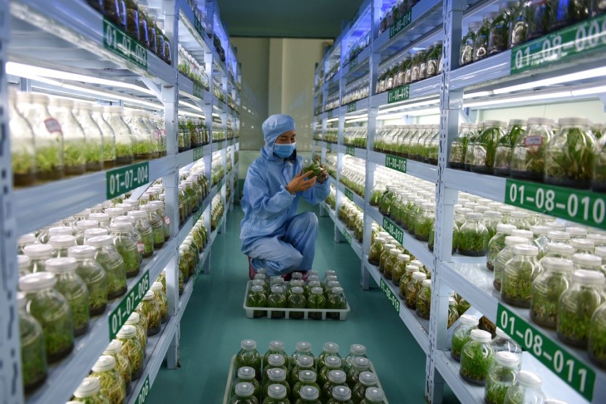 4月26日,瑤鄉御草藥業中藥材種苗培育基地,身穿白色工作服員工在組培實取鐵皮石斛母苗,該縣中藥材種苗源源不斷從此運送各地。