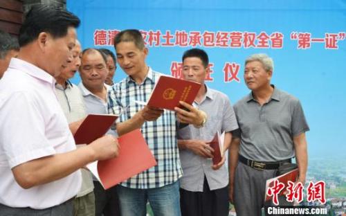 資料圖:村民代表領到了新的農村土地承包經營權證 王力中提供