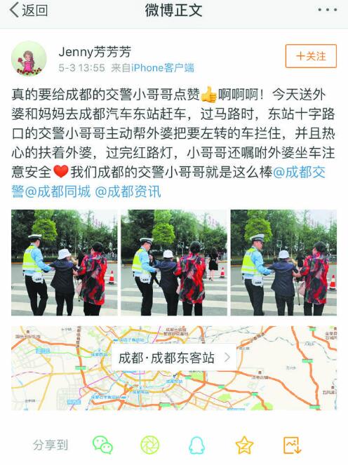 @Jenny芳芳芳:真的要給成都的交警小哥哥點贊!今天送外婆和媽媽去成都汽車東站趕車,過馬路時,東站十字路口的交警小哥哥主動幫外婆把要左轉的車攔住,并且熱心的(地)扶著外婆,過完紅路(綠)燈,小哥哥還囑咐外婆坐車注意安全。我們成都的交警小哥哥就是這么棒。