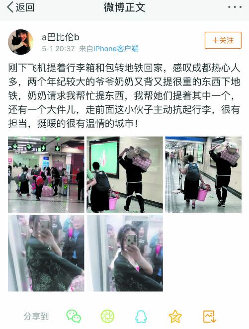 @a巴比倫b:剛下飛機提著行李箱和包轉地鐵回家,感嘆成都熱心人多,兩個年紀較大的爺爺奶奶又背又提很重的東西下地鐵,奶奶請求我幫忙提東西,我幫她們提著其中一個,還有一個大件兒,走前面這小伙子主動抗(扛)起行李,很有擔當,挺暖的很有溫情的城市!