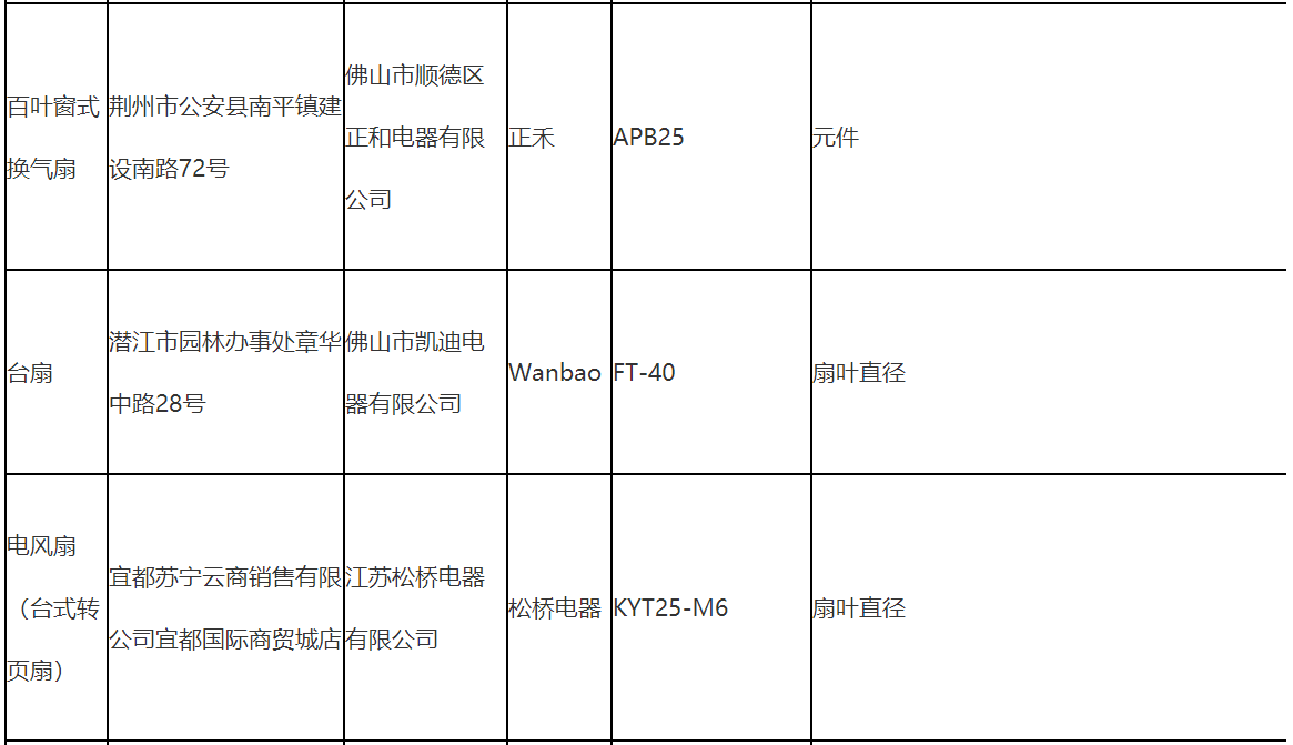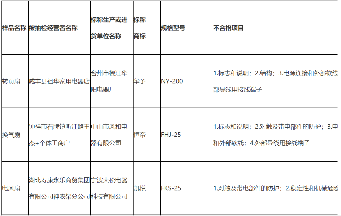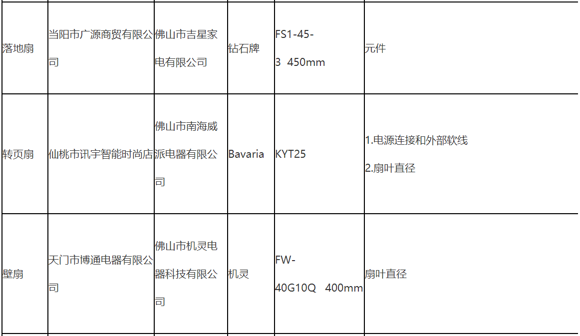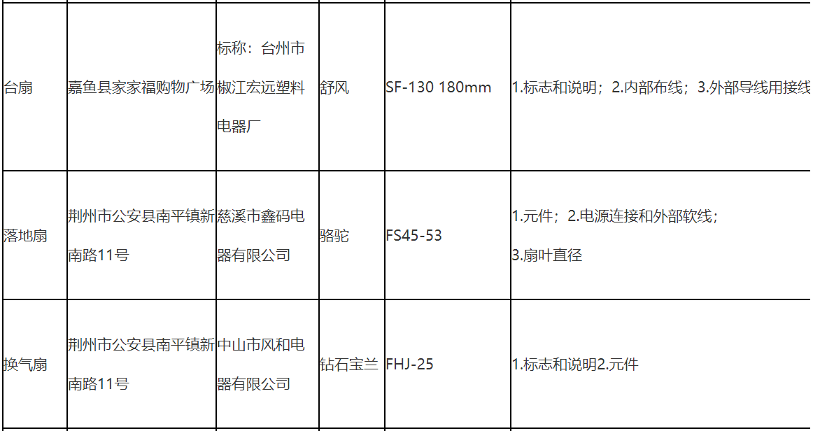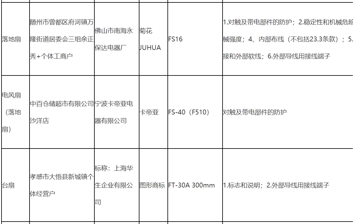 不合格樣品標稱品牌涉及華予、恒帝、凱悅、菊花JUHUA、卡帝亞、舒風、駱駝、鉆石寶蘭、正禾、Wanbao、松橋電器、鉆石牌、Bavaria、機靈、萬寶等。