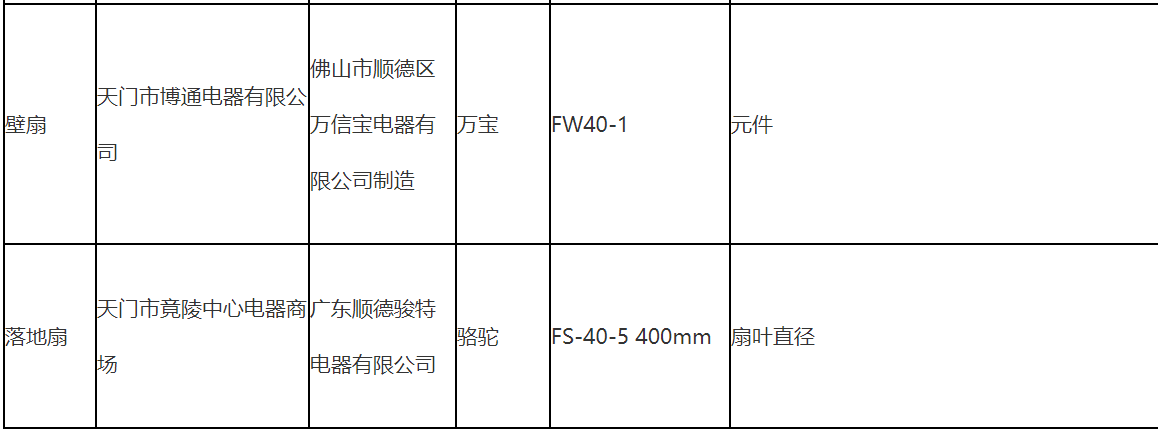 中國消費者報武漢訊(記者 吳采平)近日,湖北省市場監督管理局公布了對流通領域家用電器商品的抽檢結果,菊花JUHUA、駱駝、萬寶等17批次換氣扇、電風扇(落地扇)、臺扇抽樣不合格。