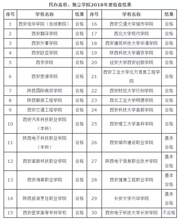 近日,陜西省教育廳發布關于民辦高校、獨立學院2018年度檢查結果的通報。涉及的30所學校中,25所學校的檢查結果為合格,4所學校的檢查結果為基本合格,1所學校的檢查結果為不合格,不合格的學校為西安電子科技大學長安學院。