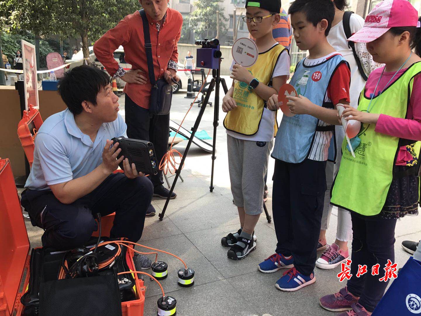 地震技術(shù)人員向小學(xué)生們介紹,如何用音頻生命探測(cè)儀尋找受災(zāi)人員