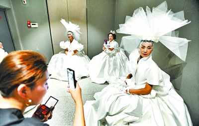媽媽級模特在后臺化妝造型,為大秀作準備