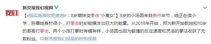 視頻中的這對(duì)兄妹來(lái)自貴州省畢節(jié)的貧困山區(qū),而年僅8歲的主人公名叫“小湯圓”,她與自己的哥哥在自家院壩練習(xí)拳擊,在訓(xùn)練過(guò)程中兩人的對(duì)抗非常激烈,“小湯圓”還經(jīng)常用自己犀利的出拳將哥哥打得節(jié)節(jié)敗退。