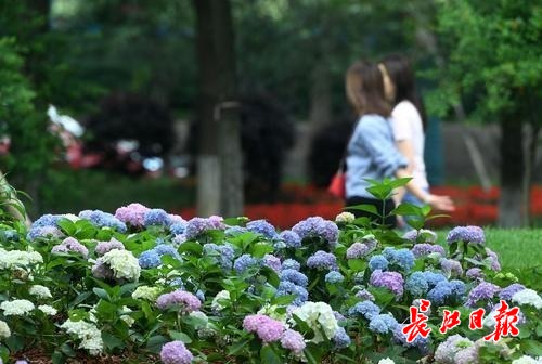 16日,武漢開發(fā)區(qū)東風(fēng)大道綠化帶里的大片繡球花盛開。記者李子云 攝