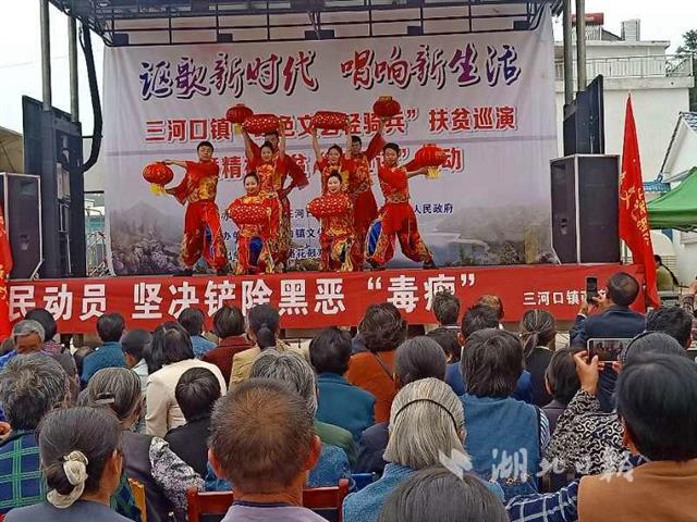三河口鎮(zhèn)有24個(gè)行政村,該鎮(zhèn)與市東路花鼓戲劇院和市麻鄉(xiāng)約藝術(shù)團(tuán)兩支“紅色文藝輕騎兵”對(duì)接,每個(gè)村都要舉辦一場(chǎng)扶貧文藝演出暨精神脫貧“雙宣講”活動(dòng),進(jìn)一步提高精準(zhǔn)扶貧政策知曉率和群眾滿意度,助力廣大群眾進(jìn)一步堅(jiān)定脫貧致富奔小康的信心和決心。