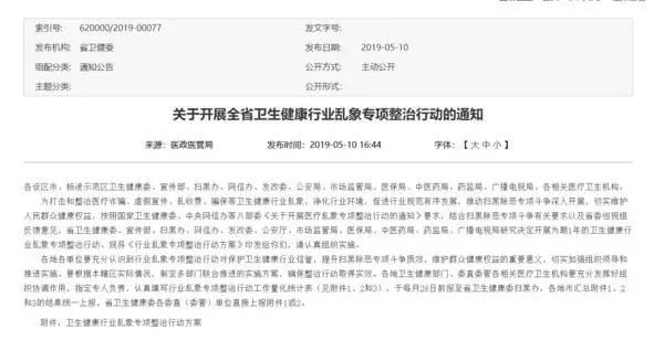 5月10日,陜西省衛健委官方網站發布一則《關于開展全省衛生健康行業亂象專項整治行動的通知》(以下簡稱:《通知》)。按照國家衛生健康委等八部委《關于開展醫療亂象專項整治行動的通知》要求,結合掃黑除惡專項斗爭有關要求以及省委巡視組反饋意見,將開展為期1年的衛生健康行業亂象專項整治行動。