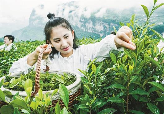 圖為:土家姑娘采摘有機茶葉。(文林攝)