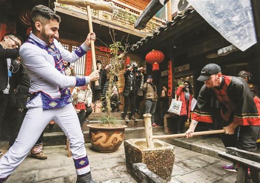 圖為:外國游客體驗土家文化民俗。(劉穎潔攝)