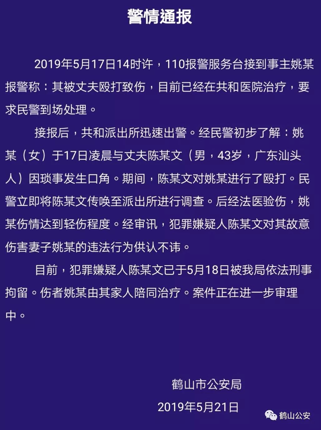 鶴山市公安局21日下午通報,被打女子17日報警稱被丈夫毆打,經法醫驗傷達到輕傷程度。犯罪嫌疑人已于5月18日被鶴山市公安局依法刑事拘留。