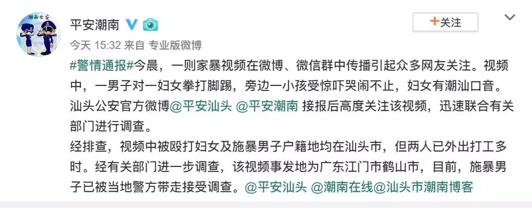 視頻中,一男子對一婦女拳打腳踢,旁邊一小孩受驚嚇哭鬧不止。因被家暴女子有潮汕口音,汕頭公安隨即進行跟進調查。5月21日?@平安潮南 發布警情通報稱,視頻中被毆打婦女及施暴男子戶籍地均在汕頭市,但兩人已外出打工多時。經有關部門進一步調查,該視頻事發地為廣東江門市鶴山市,目前,施暴男子已被當地警方帶走接受調查。