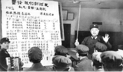 1981年傅庚辰教戰士們唱電影《雷鋒》主題歌 丁建偉攝/光明圖片