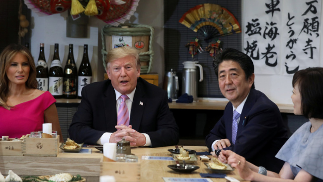 日媒稱,日方精心安排了這三頓飯,特別是晚餐,選擇了位于東京六本木地區的“爐端燒(日本一種燒烤料理形式)”店。起初日本政府想將晚餐安排在牛排店,但考慮到“光吃肉,大總統該膩了吧”,才定下這家。兩國首腦的夫人也同桌吃了晚飯。當店員端上當晚第一道菜“黃油土豆”時,特朗普露出了笑容:“真是美妙的夜晚!”同時表示自己度過了充實的一天。安倍也陪笑著回應:“想(和您)邊放松、邊慢慢交換意見。”