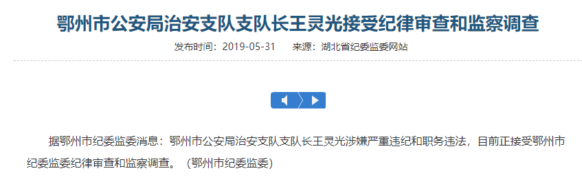 據鄂州市紀委監委消息:鄂州市公安局治安支隊支隊長王靈光涉嫌嚴重違紀和職務違法,目前正接受鄂州市紀委監委紀律審查和監察調查。(鄂州市紀委監委)