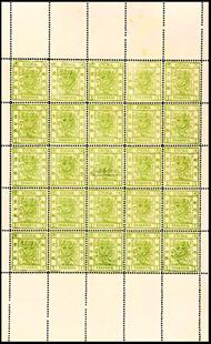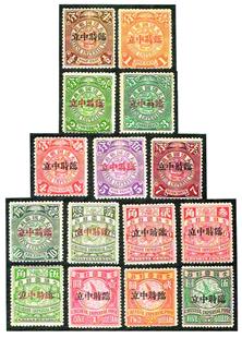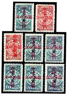 在所有紅印花加蓋暫作郵票中,紅印“小字“當壹圓”郵票是最先加蓋,只試版印樣50枚送審,但由于郵政當局認為加蓋的字形太小、使用不便,隨即下令停止加蓋。試印的紅印花小字“當壹圓”郵票雖然沒有正式發行,卻也并未銷毀,現存世僅30余枚,大多都是新票,銷有八卦戳的舊票僅發現1枚,是傳世孤品。