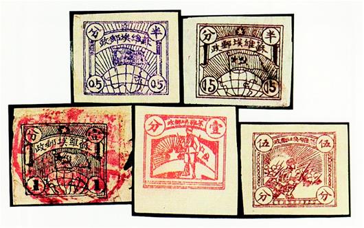淮南區交通總站在1943年發行的“稿”字郵票,圖案整體為紅色印刷,中心為內有面值數字“20”(分)的五角星,四周用紅色線條展現放射的光芒,上方是拉丁化新文字“XUAI NAN”(淮南),郵票正中心加蓋黑色2號宋體“稿”字。“稿”字郵票承載了抗戰時期的珍貴歷史,由于彼時物資短缺,該郵票由《新路東》報社以石版印刷在電碼紙背面,無齒孔,專用于寄遞新聞稿件,大部分在戰爭中被毀,目前僅發現存世10枚,唯一的四方連孤品將在世界郵展中展出。