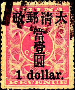 上海海關造冊處奉命將庫存未使用的65萬枚3分海關印花票(俗稱“紅印花”),加蓋1分、2分、4分、1元、5元等5種面值以應急需,于1897年2月2日開始發行。