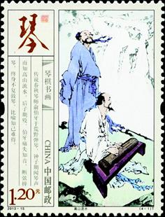 《琴棋書畫》“高山流水”郵票,講述俞伯牙與鐘子期在武漢漢陽“高山流水遇知音”的故事,發行于2013年7月13日。