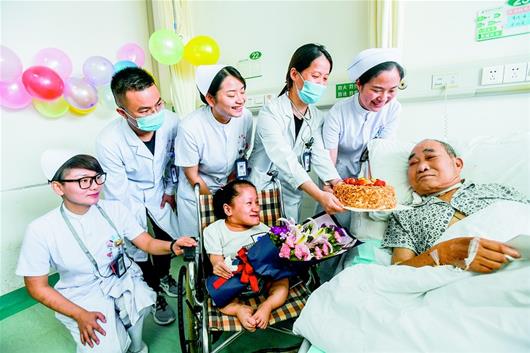 沒想到厄運再次來臨。2016年底,王克儉查出前列腺癌。武漢市中心醫院后湖院區腫瘤科副主任醫師呂曉涓說,目前患者腫瘤轉移侵犯了膀胱、輸尿管。王克儉考慮到手術費用,不愿做手術,這一切都是瞞著女兒。王靜不能常去醫院,她打電話詢問才得知父親病情。“不知道我們父女倆還剩多少日子,只想珍惜現在的每一天。”王靜說,她找到護士長張芹商量,想陪爸爸過一次父親節。醫護人員決定配合她的“秘密行動”。昨日,鮮花、氣球、蛋糕……在醫護人員的簇擁下,原本冷清的病房變得溫馨起來。“長這么大,第一次這么正式的給您過父親節。”王靜拿出一份寫給父親的信,讀道:“我會好好珍惜自己,只為了您半輩子為我付出的所有……希望我親愛的老爹,身體能快點好起來。”對握筆發力困難的她來說,這一封200字的信,一筆一劃,她足足寫了4天。