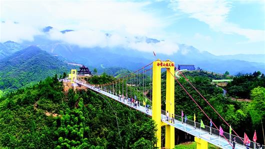 圖為:崇陽縣柃蜜小鎮玻璃天橋。柃蜜小鎮打造了以木屋別墅群、玫瑰山、動物園、水上游樂、空中滑翔、玻璃天橋等于一體的休閑旅游綜合體。(湖北日報全媒記者 陳勇 通訊員 汪佳 攝)