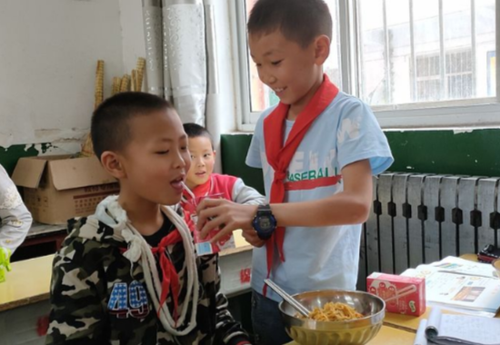 看到王思博吃飯時連拿筷子都困難,吳喬木就主動給他喂飯。王思博的同桌孫皓宇幫他打飯、洗碗,上課時幫他翻書、記筆記,放學幫他收拾書包。班上其他孩子也悉心照顧著雙手不方便的王思博。