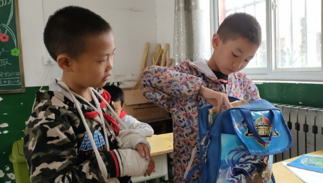 據悉,照片里的孩子是陜西寶雞市眉縣槐芽鎮中心小學二年級學生吳喬木。他的同學王思博因意外雙手手腕骨折,為了不耽誤學習,王思博返校,但是學習、生活面臨諸多不便。
