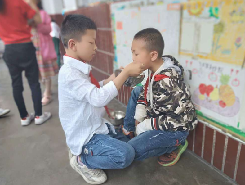 近日,一張“小學生給同學喂飯”的照片受到眾多市民點贊。據悉,照片里的孩子是陜西眉縣槐芽鎮中心小學二年級學生吳喬木。他的同學王思博因意外雙手手腕骨折。看到王思博吃飯時連拿筷子都困難,吳喬木就主動給他喂飯。班上其他孩子也悉心照顧著受傷的王思博。