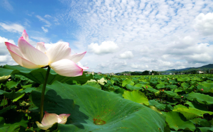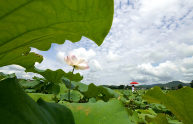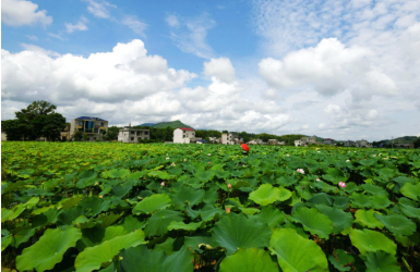 2019年6月9日,通城縣塘湖鎮狼荷村富源荷花基地的荷花陸續綻放,接天荷葉與藍天白云相伴,將鄉村映襯得更加美麗。