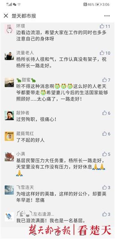 選擇警察職業,就注定選擇無悔奉獻。12日下午,楚天都市報新媒體率先推出楊睿的個人事跡,引發諸多讀者情感共鳴,報道在朋友圈刷屏。網友“流量老人”留言:“楊所長待人很和氣,工作認真沒有架子,祝楊所長一路走好?!本W友“飛雪連天”說道:“為啥這樣好的英雄,這樣的好公仆,卻要英年早逝!悲痛!”網友“MoLinke”留言:“辦案民警很辛苦,也很危險,家屬也時常活在威脅中,楊所一路走好!敬禮!”網友“環環”寫道:“邊看邊流淚,希望大家在工作的同時,也多多注意身體!”