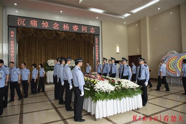 6月13日上午,楊睿同志的追悼會在青山殯儀館舉行,音樂低沉、哀婉,親友、同事含淚不忍分別。楊睿安靜地躺在棺木中,鮮花簇擁在身邊,那套伴隨了他27年的警服顯得格外耀眼。領導來了,戰友來了,認識或不認識的群眾從四面八方趕來了,大家有一個共同的心愿,向他做最后的道別,為他送行。眾人淚眼朦朧,心緒翻涌。