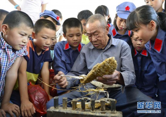 江西于都長征源小學的孩子們在觀看紅軍后人陳羅壽制作草鞋(2016年8月31日攝)。 新華社記者 周密 攝