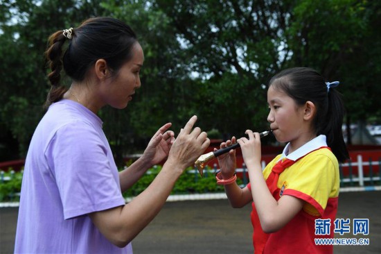 6月12日,江西于都長征源小學教師葉群英在指導“紅娃嗩吶藝術團”演奏。 新華社記者 李任滋 攝