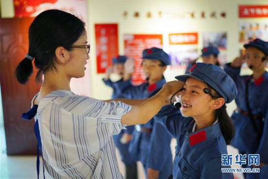 6月12日,在江西于都長征源小學,教師謝淑芳為“紅娃講解員”作指導。 新華社記者 周密 攝
