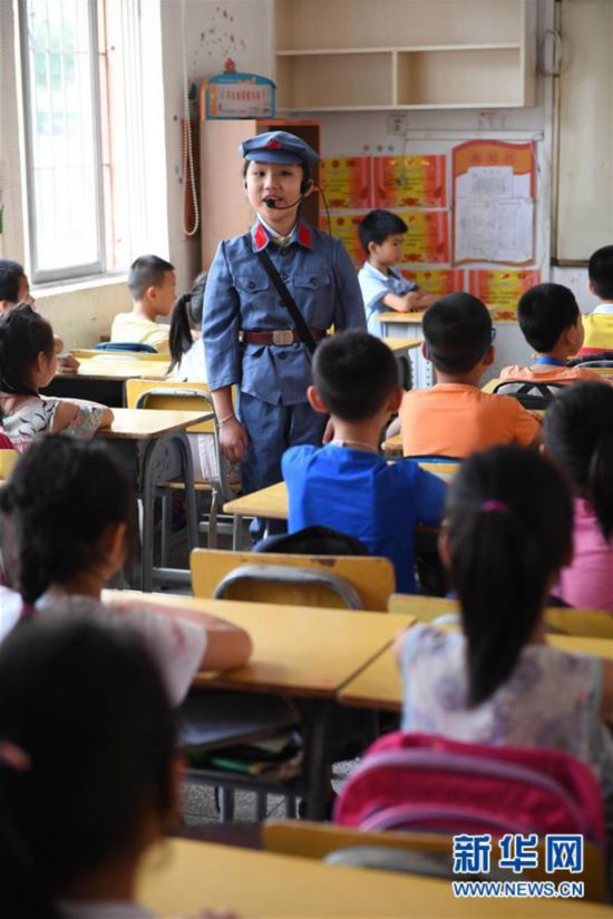 6月12日,在江西于都長征源小學,“紅娃講解員”蔡昀萱在給三年級2班同學講紅色故事。 新華社記者 周密 攝