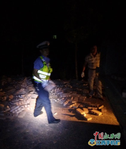 中國江西網/江西頭條客戶端訊 通訊員肖遂冬、黃耀倫、謝月明報道:日前,遂川縣公安局交警大隊草林中隊民警們深夜冒雨及時排除農用車側翻磚塊散落公路險情后,紛紛受到當地群眾及過往司機點贊。