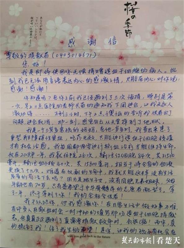 捐獻(xiàn)結(jié)束后,工作人員送上了一封受捐者的感謝信,看完了信,一向堅強(qiáng)的吳先生紅了眼眶。原來,受捐者是一名3歲男孩的母親,2年前查出身患重型再生障礙性貧血,每周都需要進(jìn)行輸血治療才能維持生命。然而在等待合適的配型進(jìn)行造血干細(xì)胞移植期間,她遭遇過3次悔捐,她在信中說,第一次遭遇悔捐時,那一刻感覺自己從天堂掉到了地獄?!暗攘?年,終于等到了你!”在信中她深情致謝吳先生:“我不認(rèn)識你,但我真誠地感謝你!是你,讓我的孩子有機(jī)會在母親的庇護(hù)下健康成長,不至于喪失母愛;是你,讓我的父母有機(jī)會在女兒的照顧下安享晚年,不至于孤苦終老;是你,讓我的愛人有機(jī)會和妻子相伴到老,不至于承受喪妻之痛!我們?nèi)叶颊嫘母兄x你!”