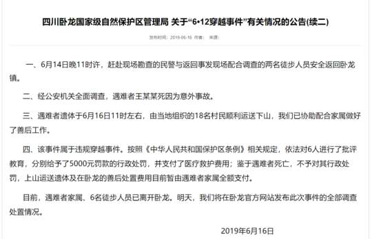 目前,遇難者家屬、6名徒步人員已離開臥龍。明天,我們將在臥龍官方網(wǎng)站發(fā)布此次事件的全部調(diào)查處置情況。