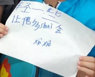 網友“轉身后的藍旗袍”說,當時就尋思,這個小男孩為啥會舉張紙,于是便走上前想看個究竟。“小男孩見我向他靠近,先是轉頭看了看旁邊的男子,又將手中的紙張向前伸了伸,好像是故意伸給我看的。”