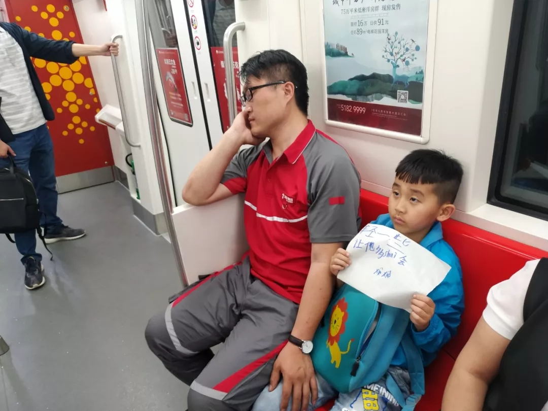 她在途中注意到,小男孩一直未放下手中的紙,當有乘客向他靠近時,他都會將手中的紙向前伸一伸。最讓她感動的是,小男孩除了舉著紙,還時刻盯著車廂門上的報站器,估計是怕坐過了站。