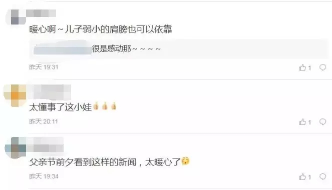 她猜測,小男孩旁邊的男子可能是他的爸爸,小男孩擔心有人會吵到睡著了的爸爸,所以才會做出這樣的舉動。這在她看來,覺得特別暖心、感動。