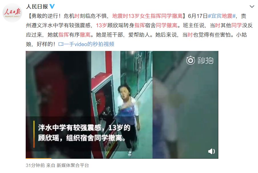 6月17日,宜賓長寧6級地震,貴州遵義泮水中學有較強震感。在所有人都在往外撤離時,13歲的學生顧欣瑤卻轉身走向樓道內,指揮宿舍同學有序撤離。