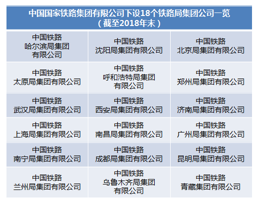 截至2018年末,中國國家鐵路集團有限公司下設18個鐵路局集團公司,具體情況如下: