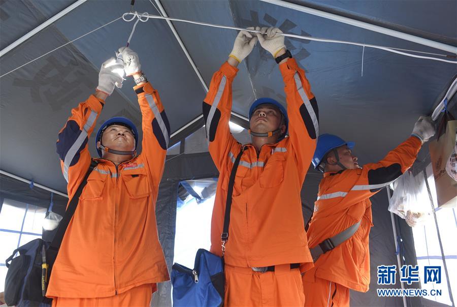 6月20日,國網成都供電公司連心橋共產黨員服務隊抗震救災臨時黨支部成員在安置點帳篷內架設電線、安裝電燈。新華社記者 劉坤 攝