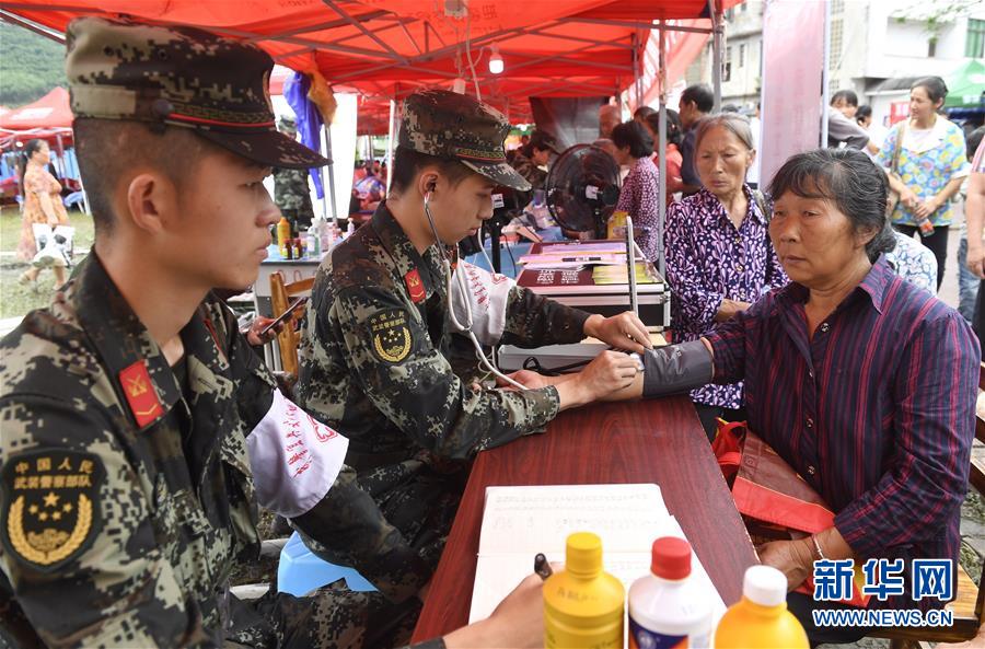6月20日,武警宜賓支隊衛生隊黨小組成員在安置點為群眾提供醫療服務。新華社記者 劉坤 攝
