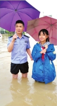 6月21日,武漢遭受一場大暴雨。擔心轄區出現漬水,武漢經濟開發區(漢南區)公安分局湖濱派出所社區民警王燕昌早早地來到社區。在經過工業園路開發區第一初級中學官土墩校區附近時,他發現這里漬水情況比較嚴重,附近水深達五六十厘米,有的窨井蓋已被積水掀開,水流湍急,存在安全隱患。王燕昌卷起褲腿站在井蓋附近,對過往學生進行引導,保護孩子們安全進校上學。